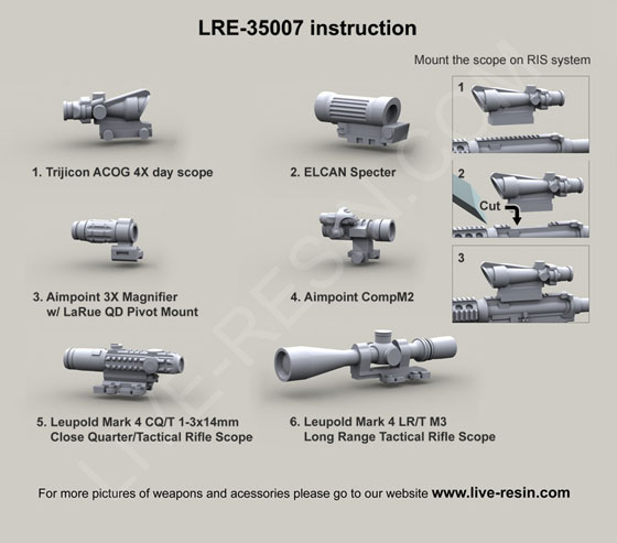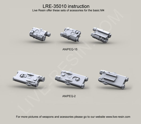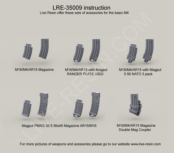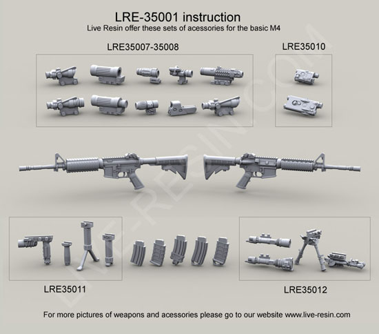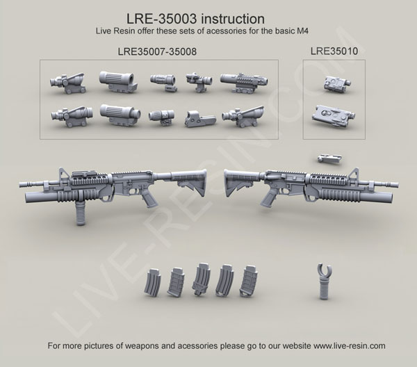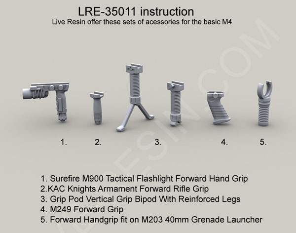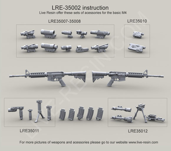 scale resin kit contains six weapons & parts as shown in upper photo. Compatible accessories for the M4 listed below: