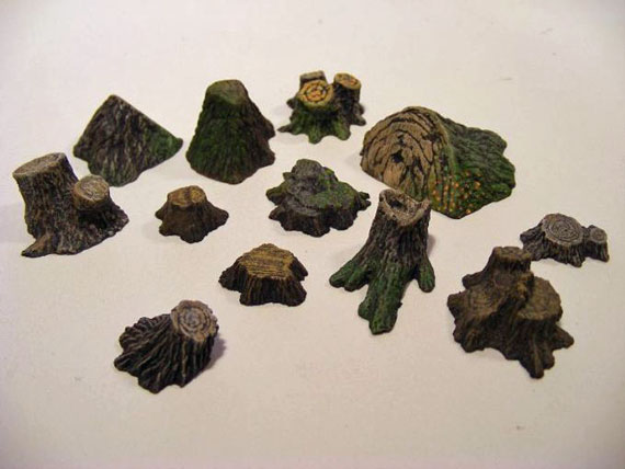 is a set of 14 realistic tree stumps in various shapes and sizes. Also